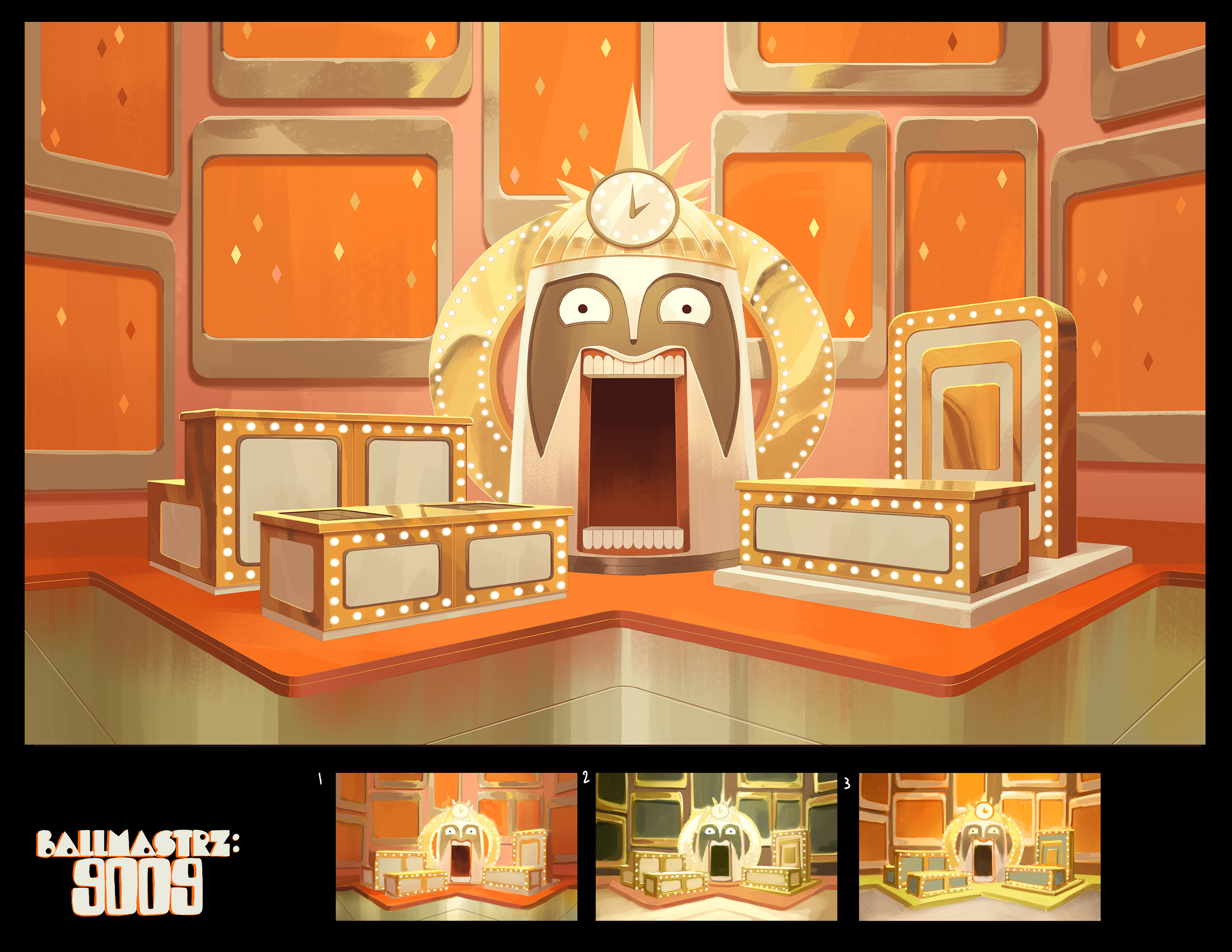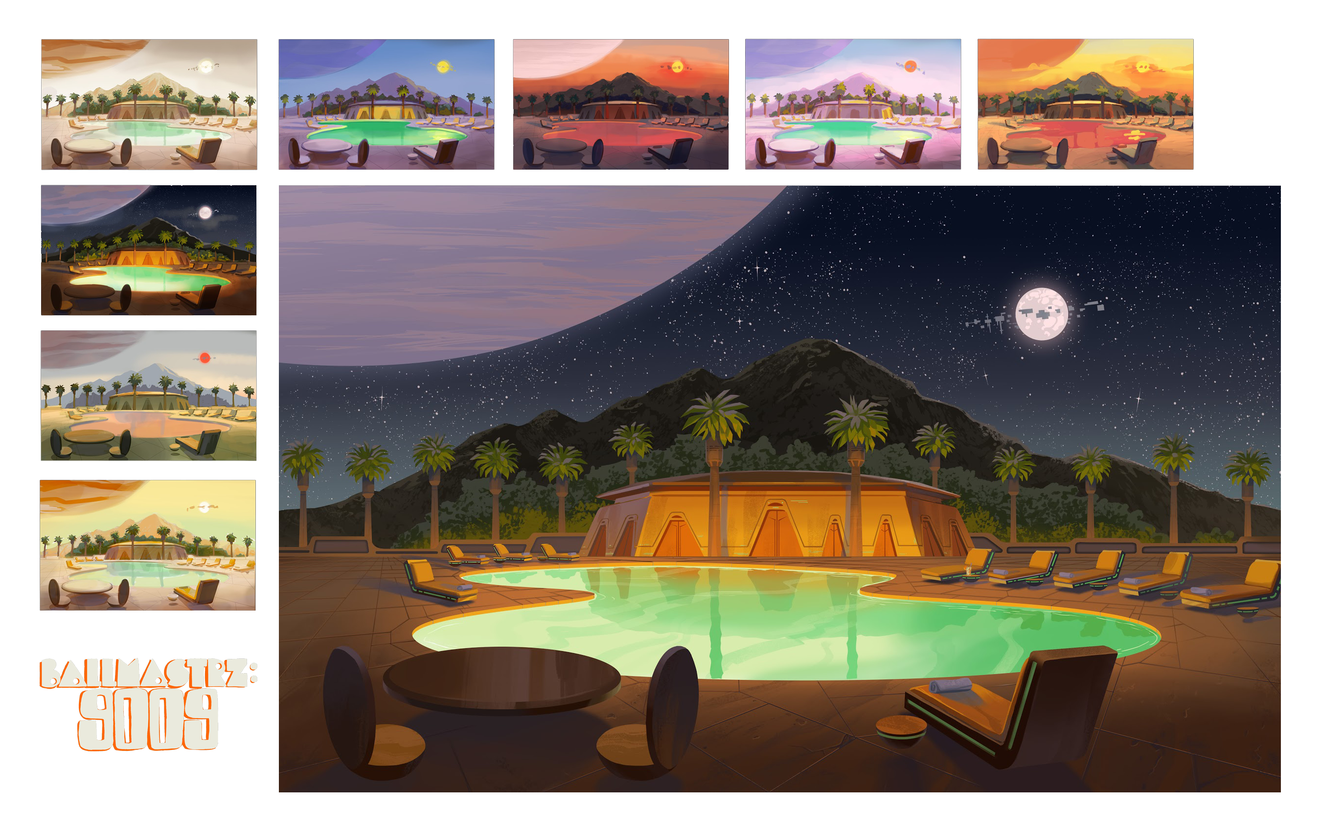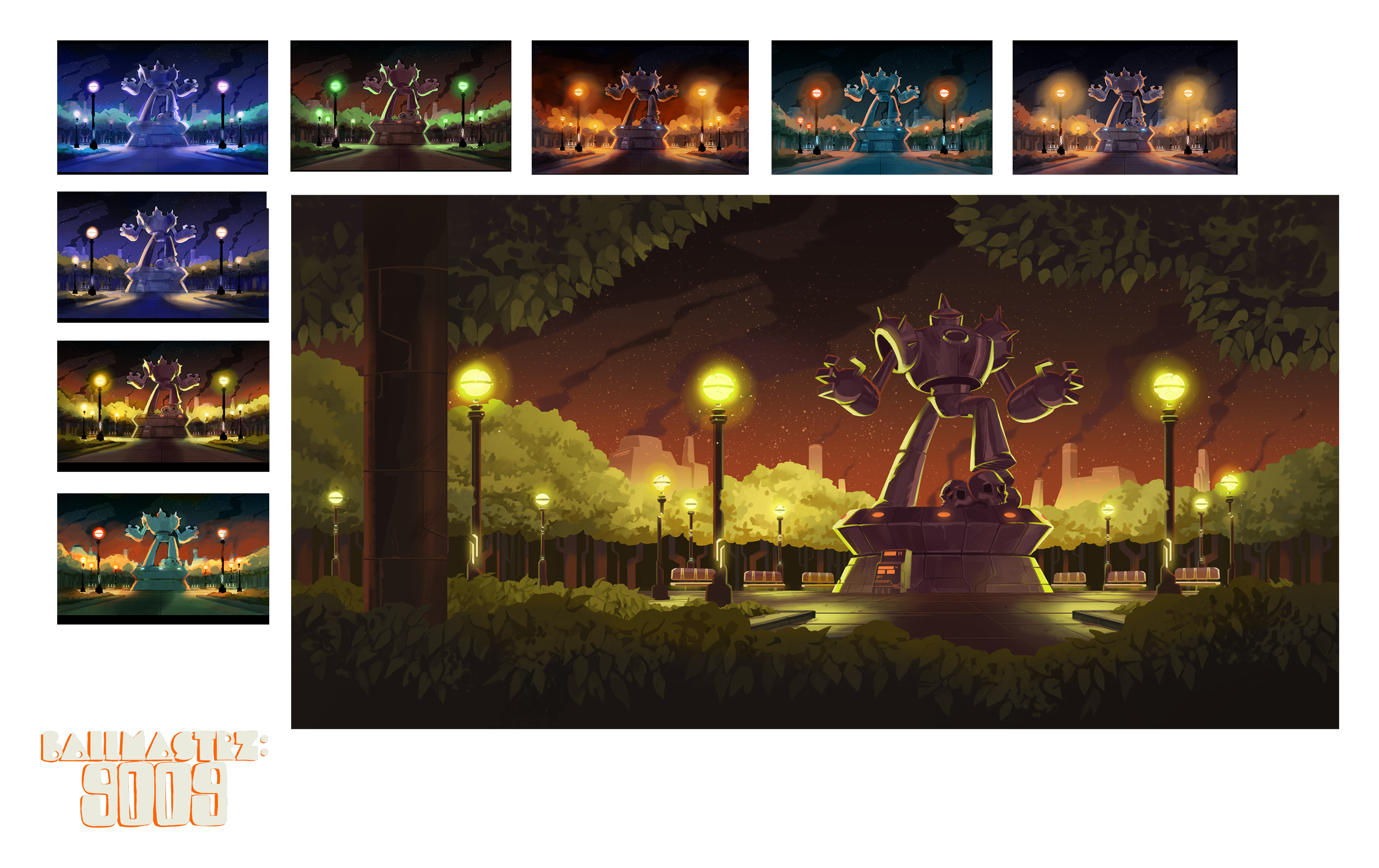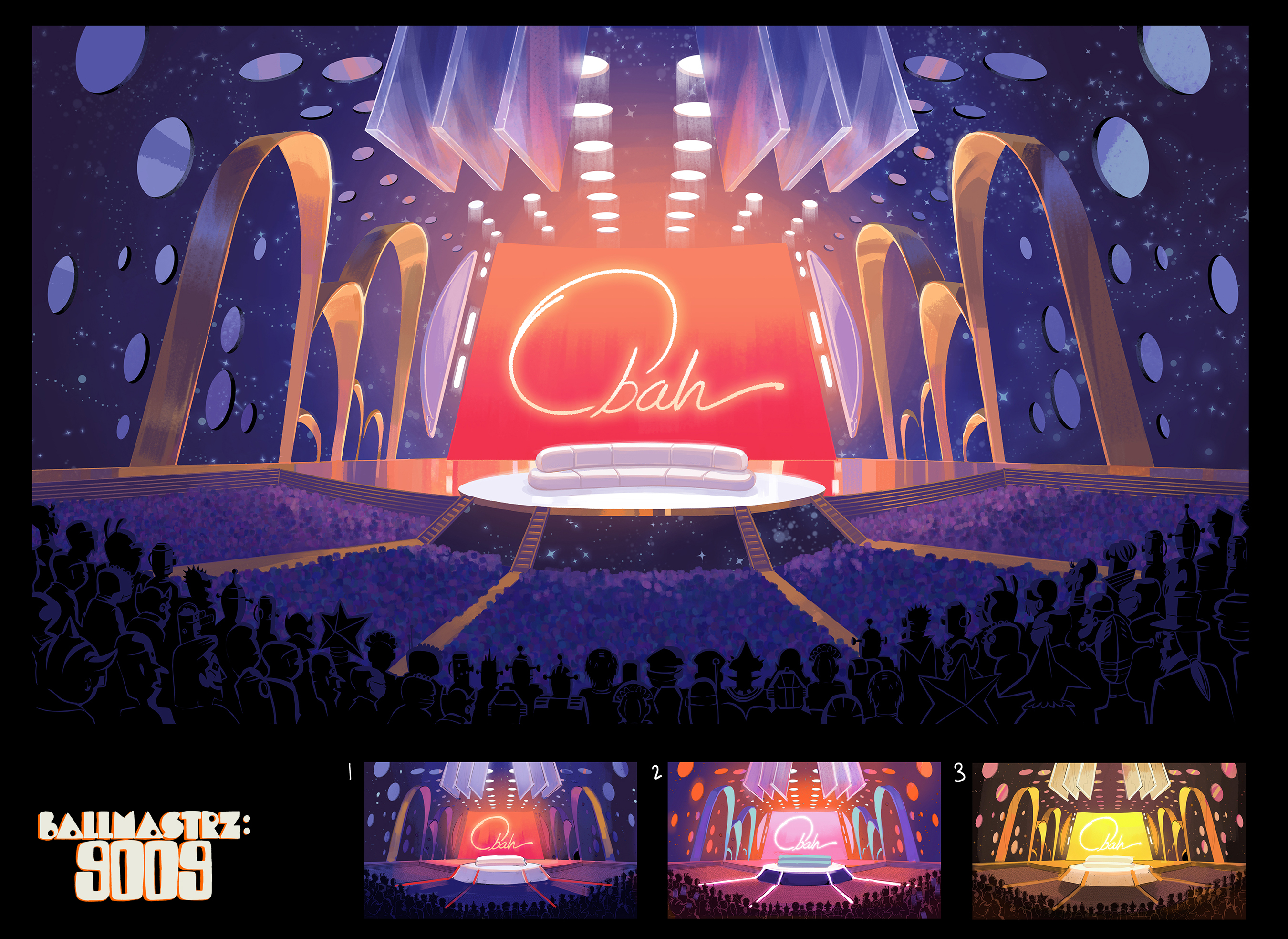 Background paintings for seasons 1 and 2 of the Adult Swim show, "Ballmastrz: 9009," with designs from Leland Goodman, Matt White, Gael Bertrand, and Sam Marlow with art direction from Andy Brinkman.