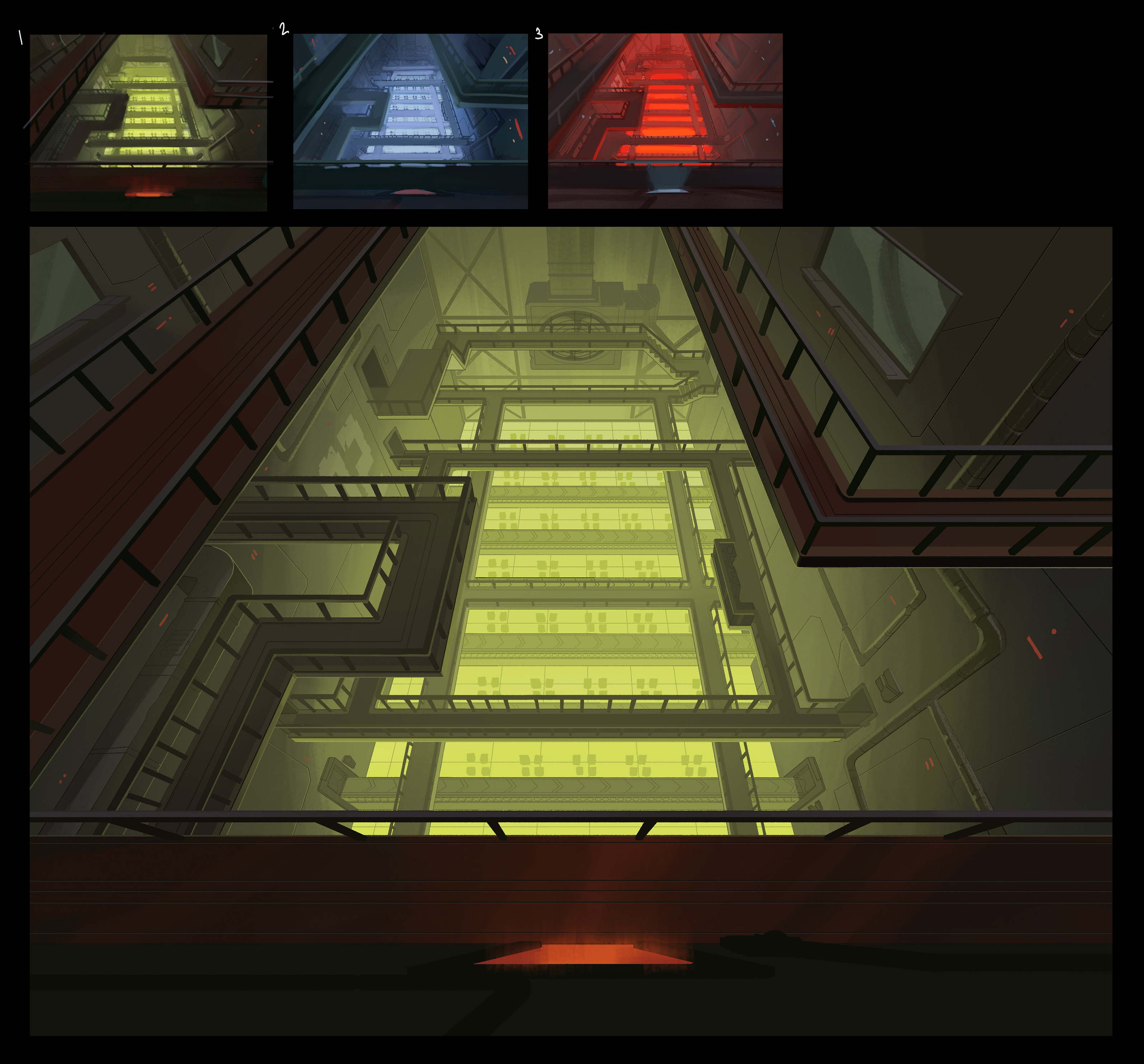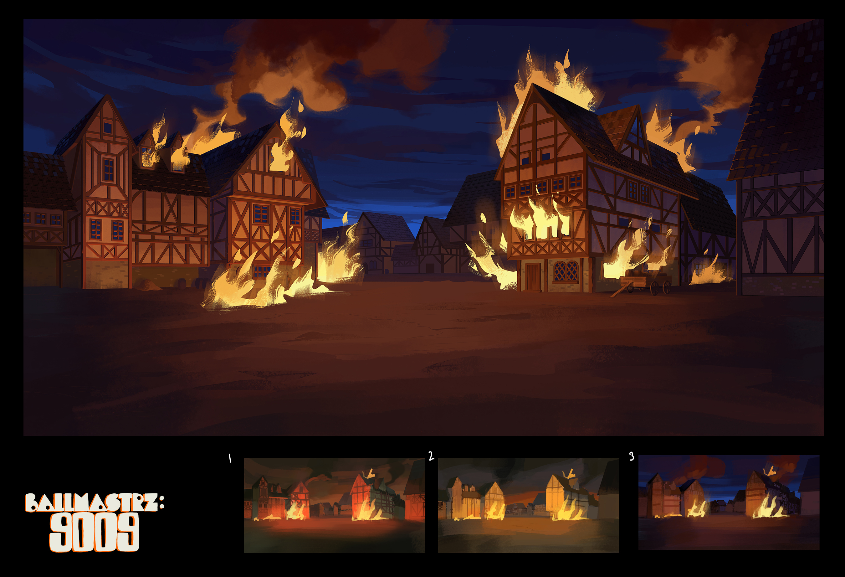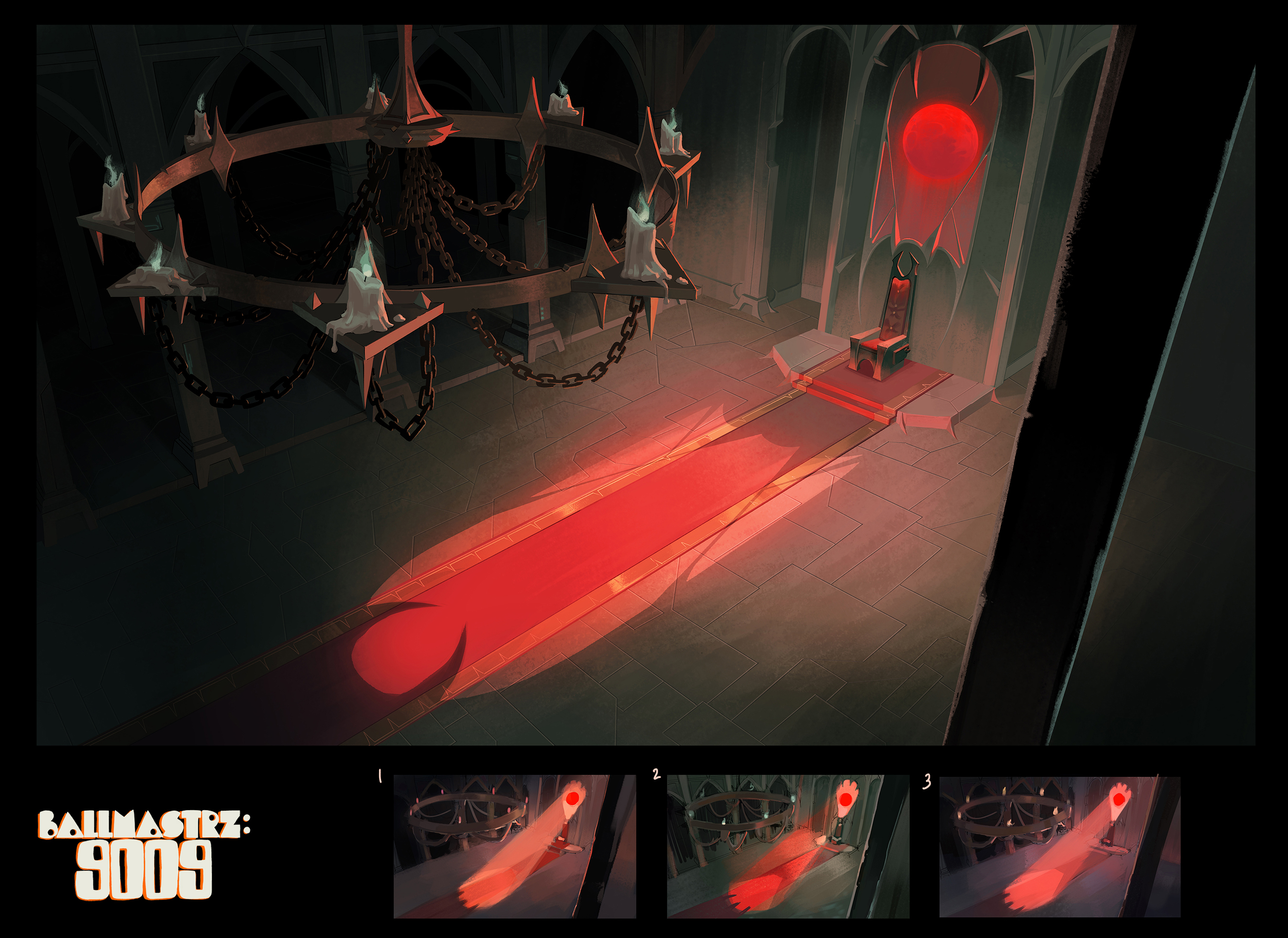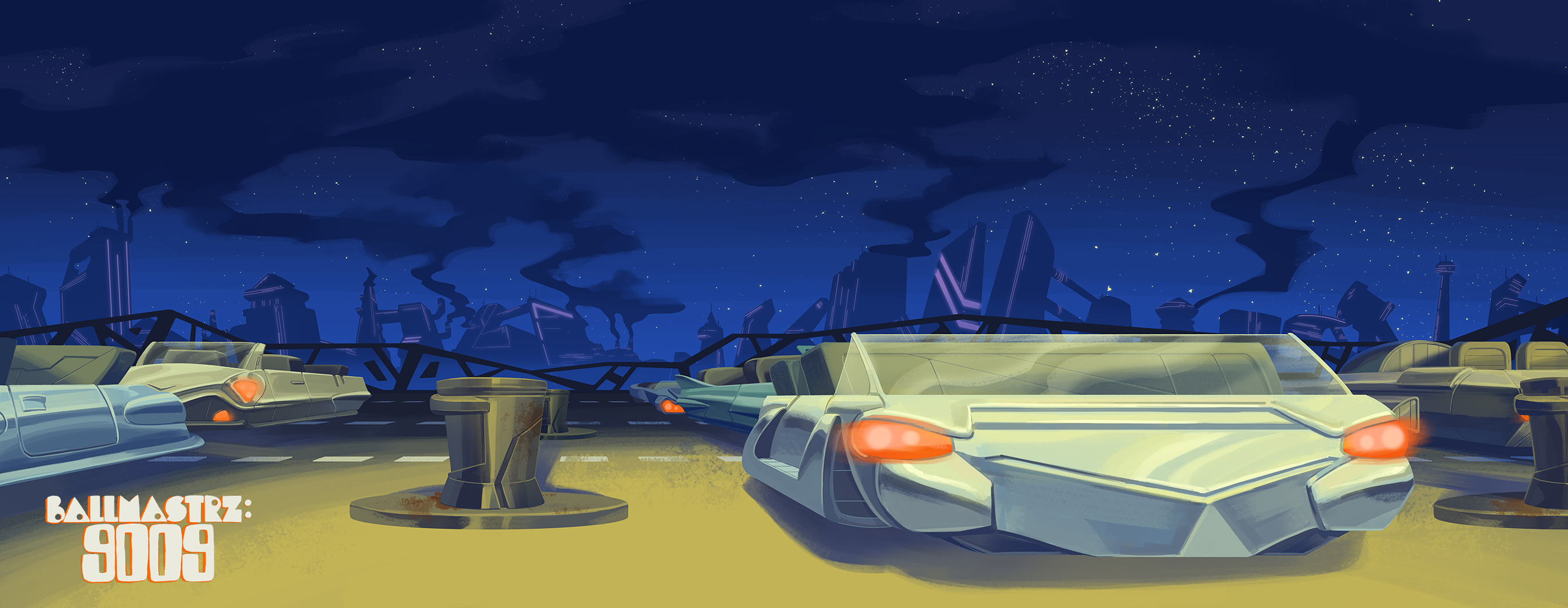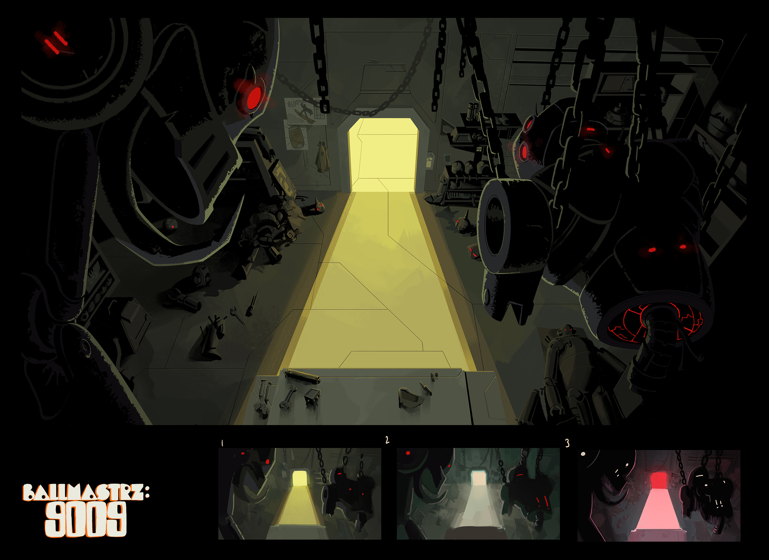 Background paintings for seasons 1 and 2 of the Adult Swim show, "Ballmastrz: 9009," with designs from Leland Goodman, Matt White, Gael Bertrand, and Sam Marlow with art direction from Andy Brinkman.