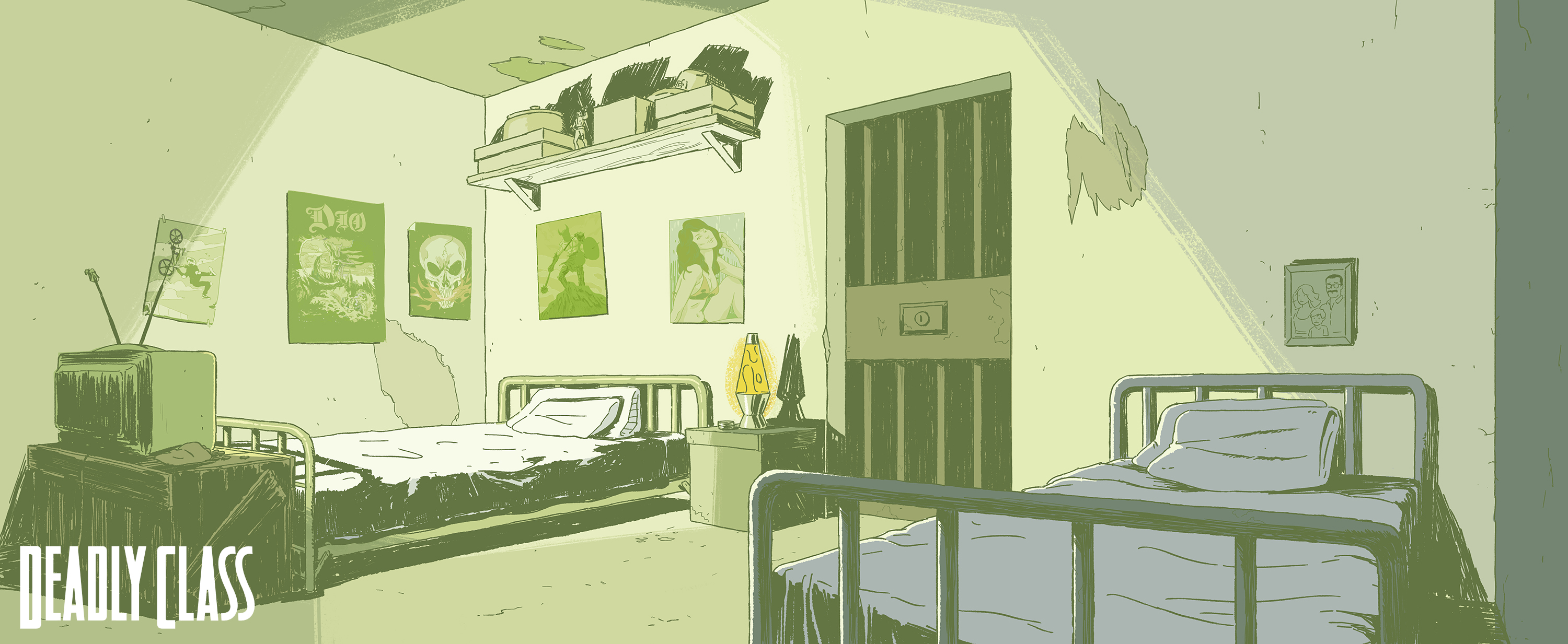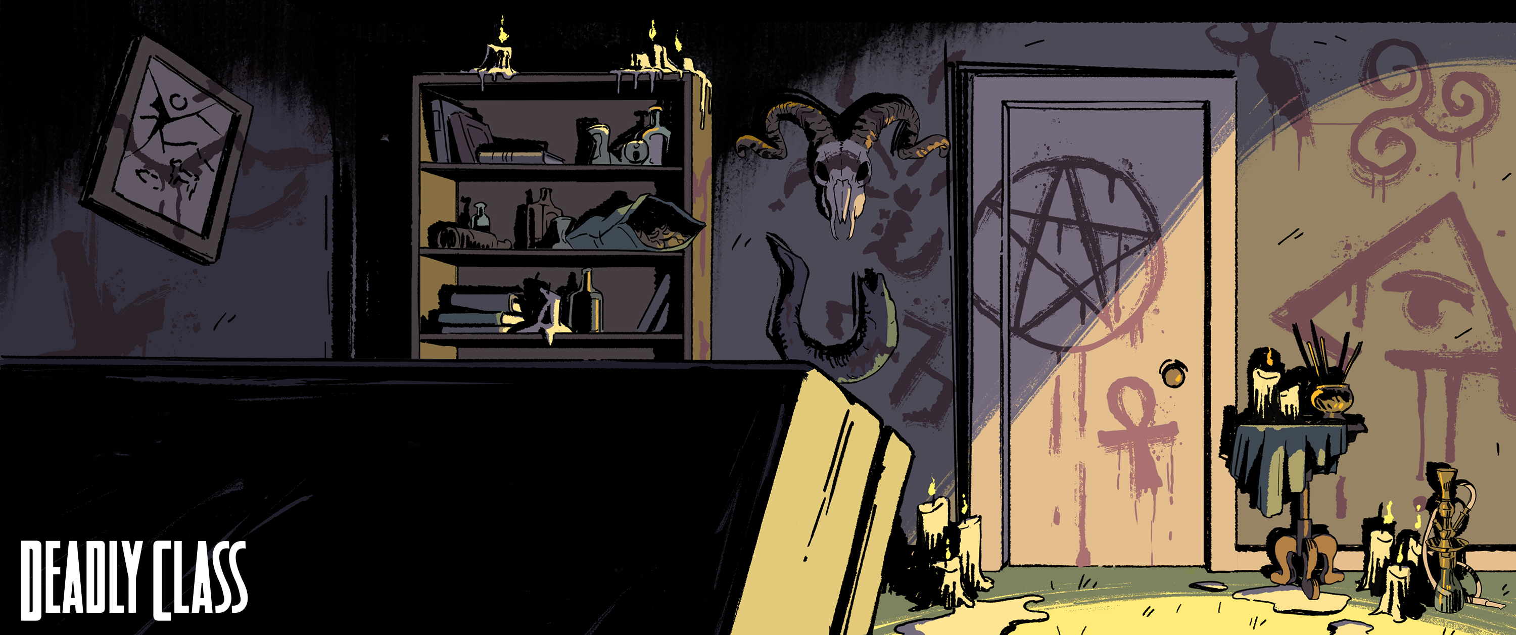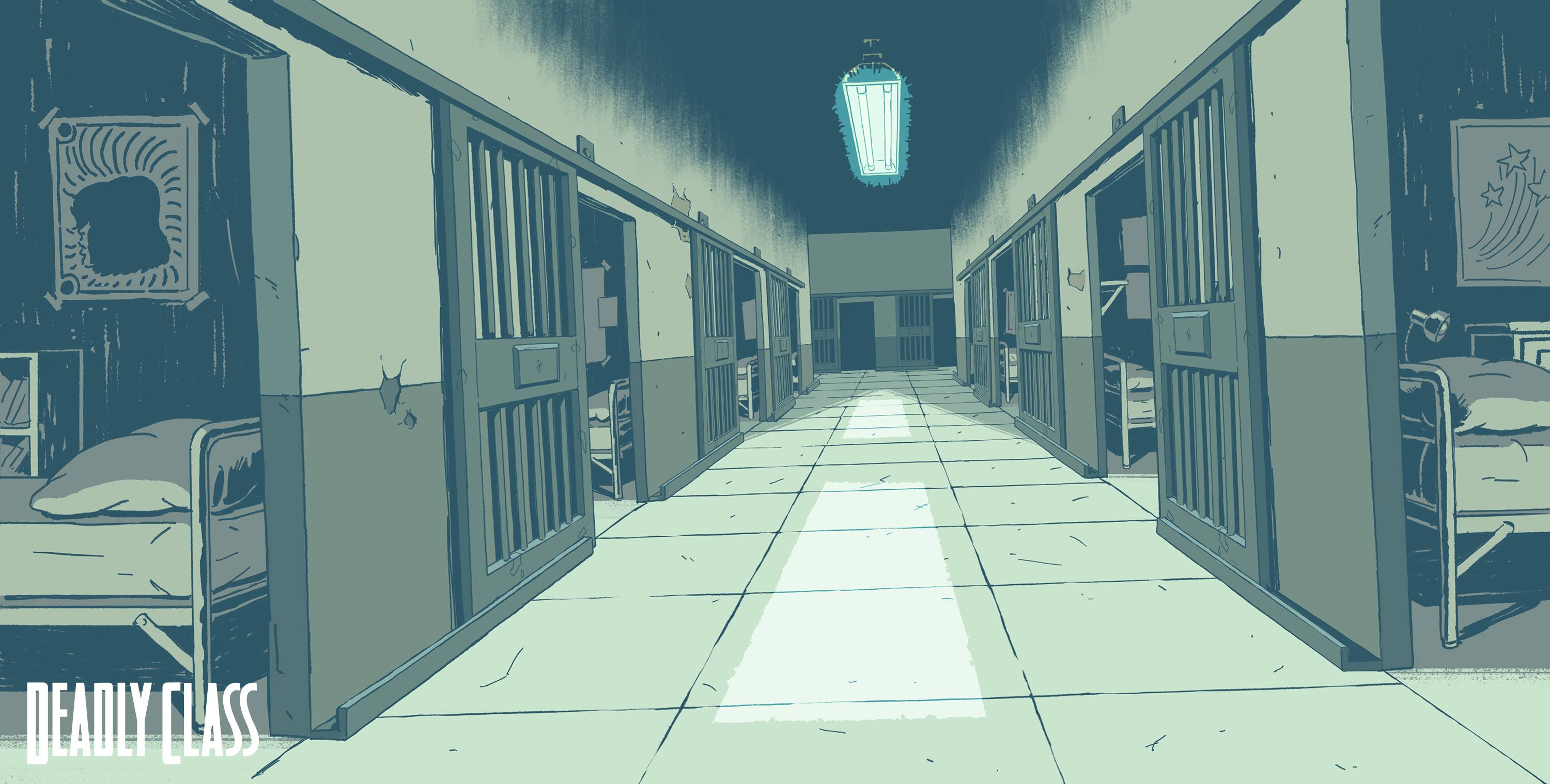 Background paintings from Syfy’s “Deadly Class.” Backgrounds designed by myself, Andy Brinkman, Sam Marlow, and Denny Fincke with Art Direction from Antonio Canobbio.